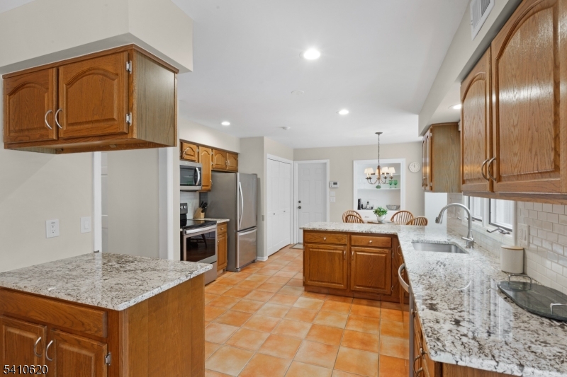 Discover this ranch-style 2 bedroom, 2.5 bath end unit townhome in the highly desirable Maple Run community. A rare opportunity for one-floor living, this home offers premier privacy backing to trees and open space. A welcoming entry opens to the living room, dining room, and kitchen, creating a seamless open concept layout. The living room features a cozy wood-burning fireplace, high ceilings, and opens to a bright office/den with French doors and abundant windows. A private deck and bluestone patio provide the perfect setting for outdoor relaxation and entertaining. This sought-after Carlton model has a beautifully updated powder room. The home is filled with natural light and immaculate hardwood floors. The refreshed kitchen includes a breakfast area, stainless steel appliances, granite countertops and a new backsplash with access to the attached 2-car garage. A convenient laundry closet in the kitchen includes a newer washer and dryer. The primary suite offers a custom walk-in closet, dressing area, and a beautifully renovated spa-inspired bath featuring dual sinks, marble vanity, and a walk-in shower. The second bedroom is also en-suite. An expansive unfinished basement offers endless possibilities for a future recreation room, home gym, or playroom. Located near shopping, dining, and recreational amenities, including nationally ranked golf courses, this home combines single-level living with an exceptional Basking Ridge lifestyle. ALL OFFERS DUE BY 6PM on Monday, 3/16. GSMLS 4013294