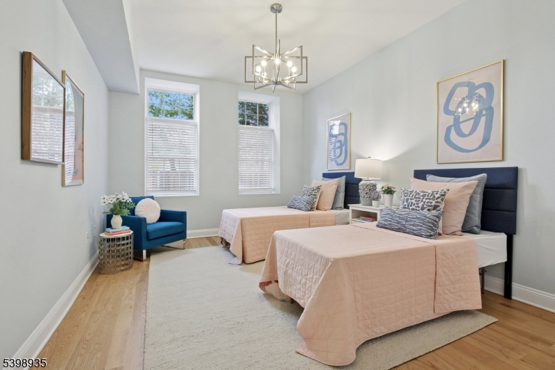 Modern living abounds in this newly renovated, sun drenched, first floor, loft style condo. An open floorplan coupled with exceptionally high ceilings, large windows allowing in extraordinary light, and freshly refinished oak flooring throughout gives this special unit an impressive feeling of light and spaciousness. The kitchen has been reimagined with a stunning marble backsplash set in a sophisticated herringbone pattern, new quartz countertops, and a suite of matte white GE Cafe appliances with brushed bronze hardware. Opening out from the kitchen breakfast bar, the living/dining area is open and welcoming to simple relaxation or robust entertaining. Two large bedrooms flank the luxurious main bath with marble tile floor and walls, and a walk-in shower tiled in gorgeous marine blue ceramic tile with brass rain head shower and handheld wand. The extra-large primary bedroom has a special reading nook and two large, fully customized walk-in closets. Second bedroom is also large with its own customized closet and soaring ceilings. Central air conditioning. Laundry in unit. Two assigned parking spots in dedicated lot. Convenient to Bloomfield Center, Montclair, Montclair State University, GSP and more. Pets welcome. GSMLS 3999432