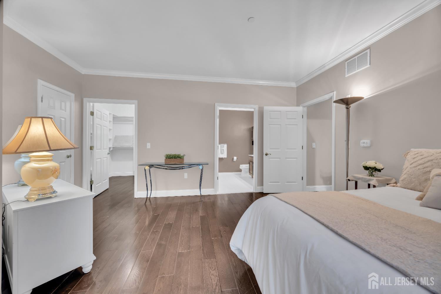 Experience refined living in the prestigious Waterford Adult Community. This elegant two-bedroom, two-bath residence blends timeless design with modern sophistication, showcasing rich hardwood flooring throughout and thoughtfully curated finishes. The kitchen is appointed with granite countertops, stainless steel appliances, and a breakfast bar perfect for both intimate meals and stylish entertaining. The expansive primary suite offers a true retreat, featuring hardwood flooring, a private balcony, and a custom California Closet. The en-suite bath includes double vanities, a bathtub/shower combination, and a separate glass-enclosed shower. A well-appointed second bedroom and full bath provide comfort and flexibility for guests or a home office. Enjoy seamless indoor-outdoor living with two private balconies, ideal for morning coffee or evening relaxation. Additional conveniences include a large, temperature-controlled storage unit located in the basement. Residents enjoy full-service amenities including a concierge, elevator access, outdoor pool, state-of-the-art fitness center, library, and a beautifully designed common kitchen delivering resort-style living with ease and elegance. Home Sweet Home! CJMLS 2609293R