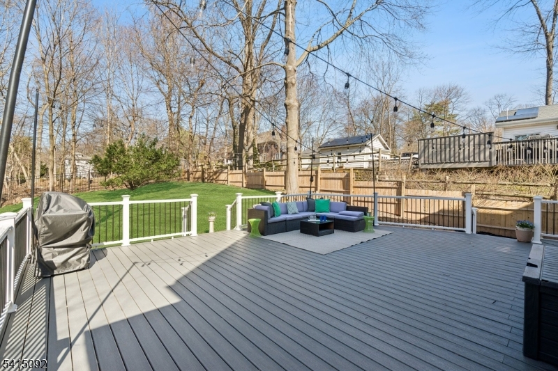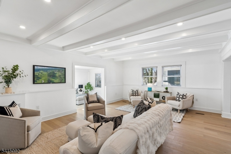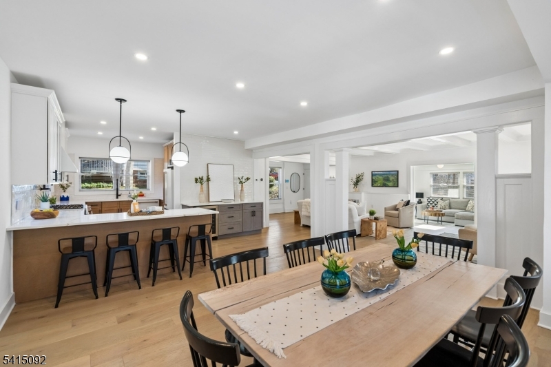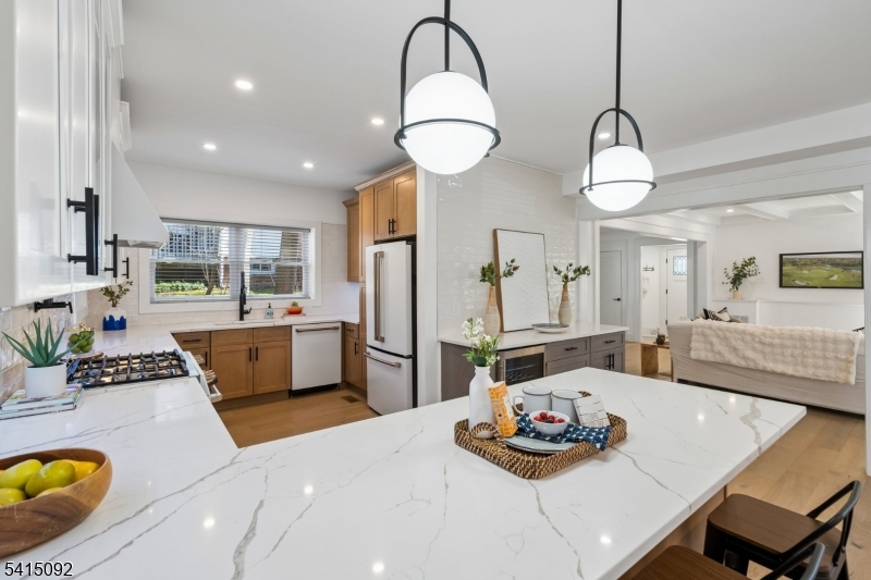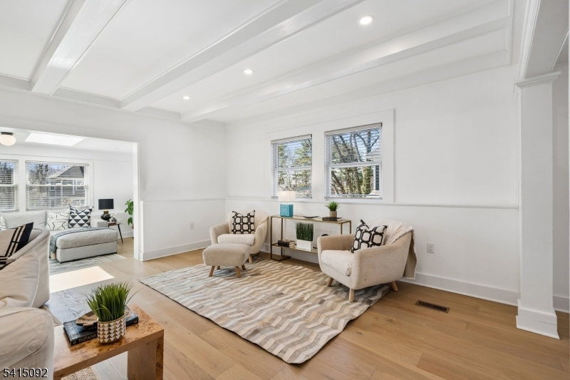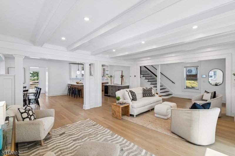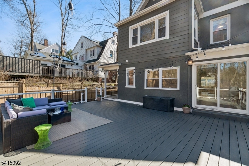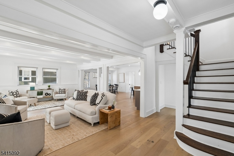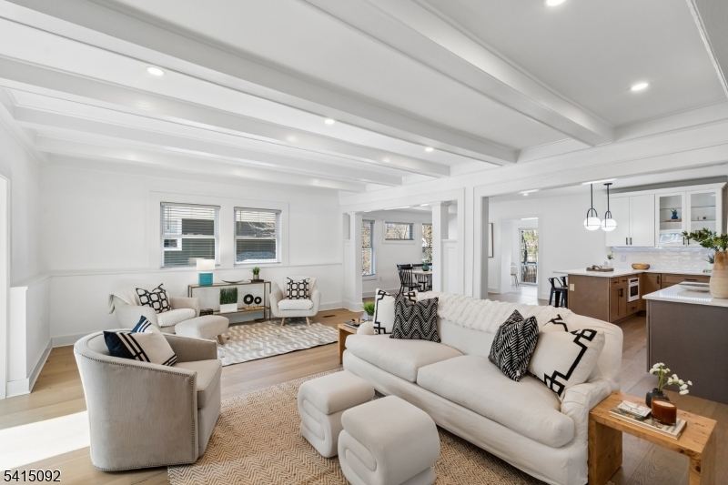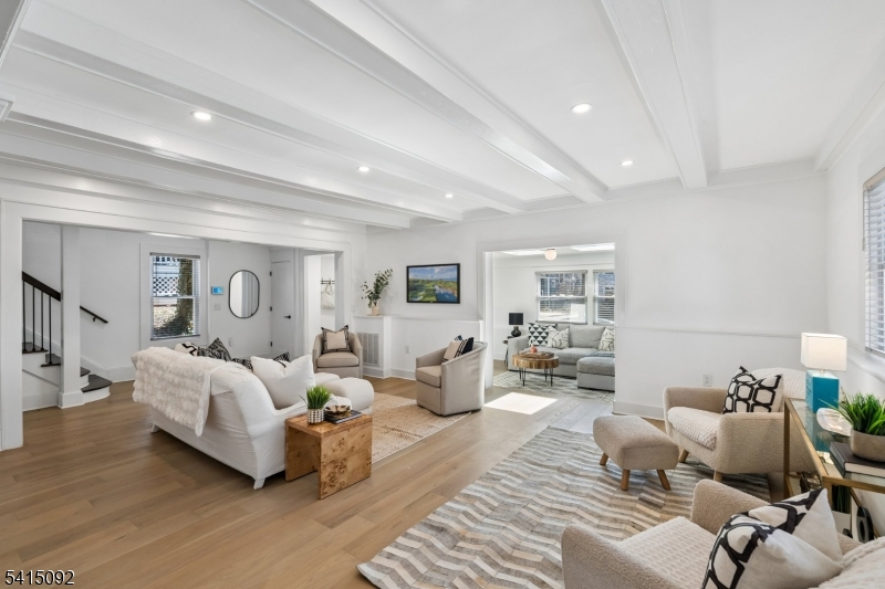 Incredible Maplewood dream home in a coveted location just steps from Village, trains and parks. Extensively renovated in 2024, this turn-key home offers nearly 4000 sq. ft. of living space across 4-levels with light-filled rooms arranged in a versatile, flowing floorplan. Enter into a dreamy, open-plan 1st floor which beautifully blends period details (beamed ceilings, wide moldings) with stunning modern finishes, including stylish lighting and wide-plank French oak flooring. The dream kitchen features high-end GE Cafe appliances, gas range with pot filler, quartz counters, tile backsplash, ceramic sink and full-height, soft-close cabinety. A breakfast bar with seating and serving bar with beverage fridge are nearby. Generous dining room and living room spaces, a sun-drenched family room, half bath and versatile sunroom overlooking the yard complete this level. Upstairs find bright bedrooms and 3 full baths, including the sophisticated primary with large walk-in closet and spacious bath with double vanity, soaking tub and glass-enclosed shower. The lower level is fully finished to offer leisure space, laundry room with sink and built-in cabinets and bonus full bath with shower and access to the garage. The fenced backyard features a composite deck overlooking a private, woodsy backyard. 2024 updates include a new roof and gutters, new thermal windows, new thermal side doors and custom built-in shelving. Smart home dimmers (1st flr), Nest thermostats and front door lock. GSMLS 4016684