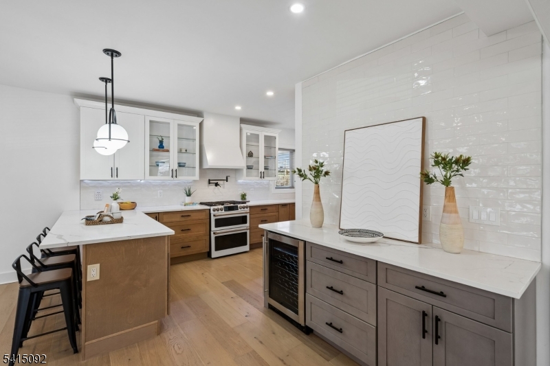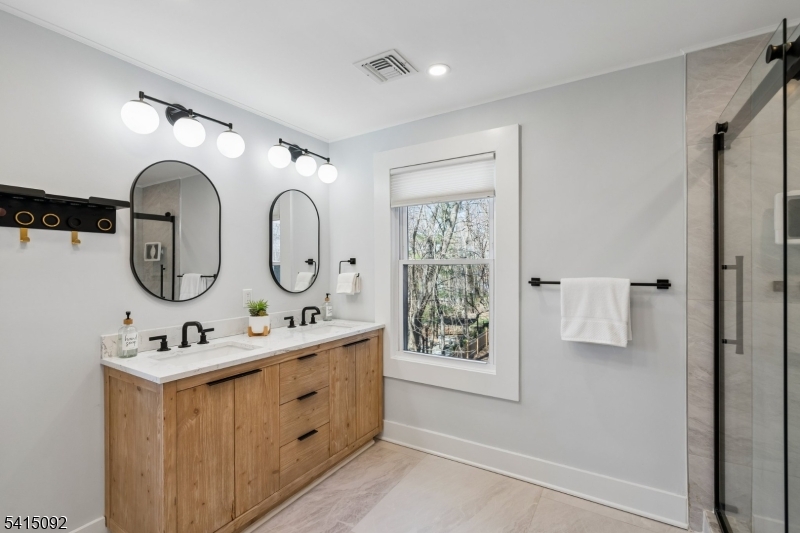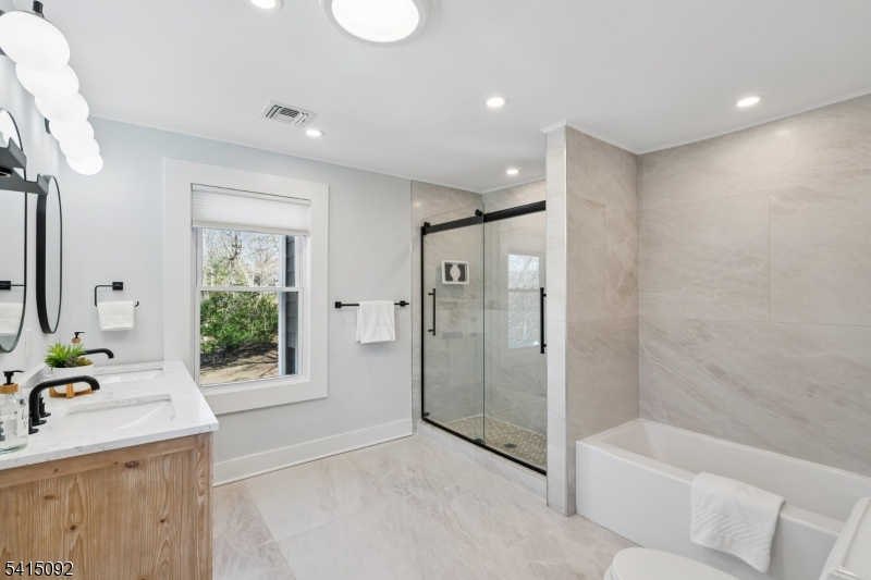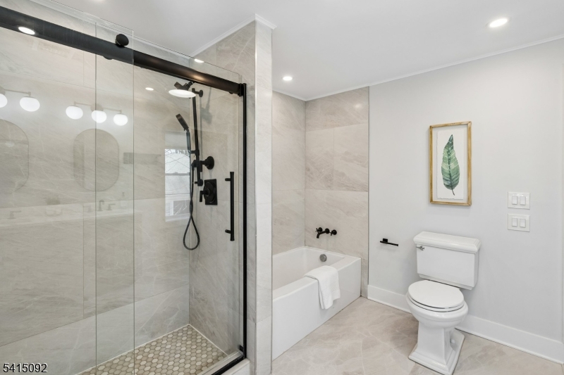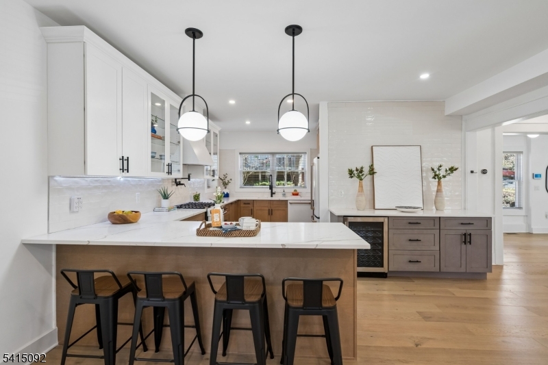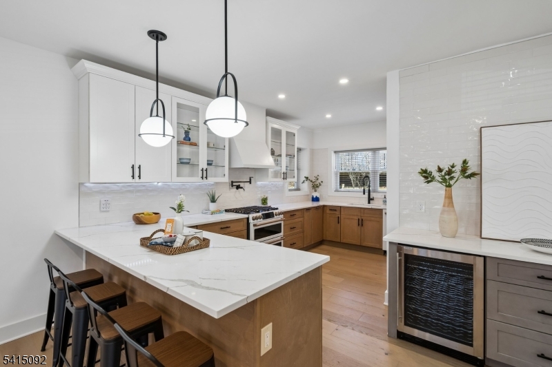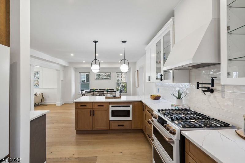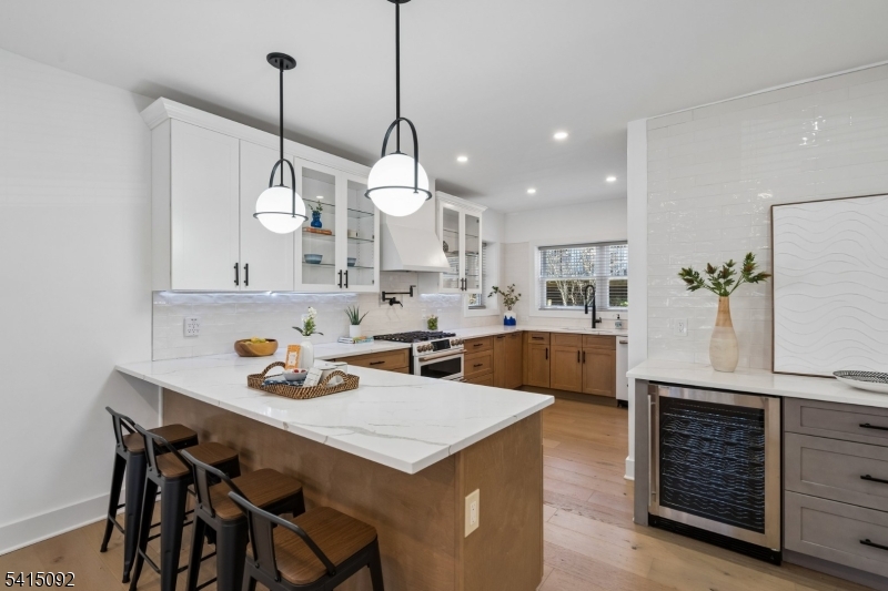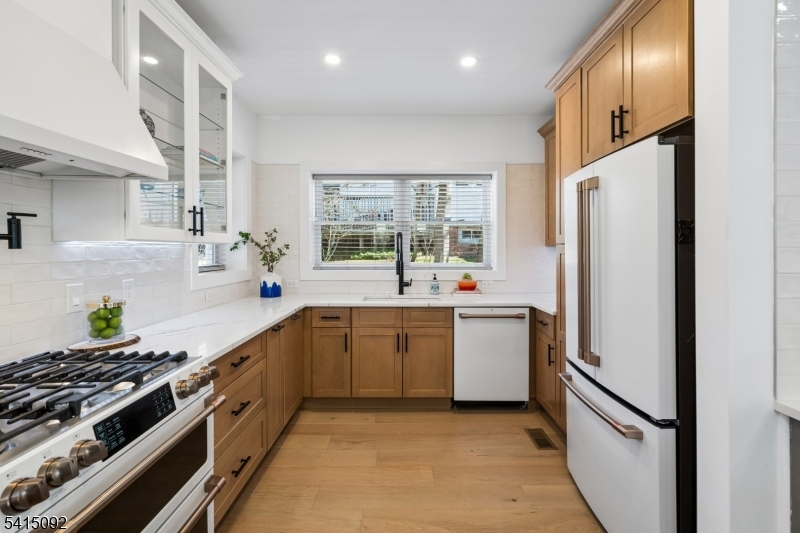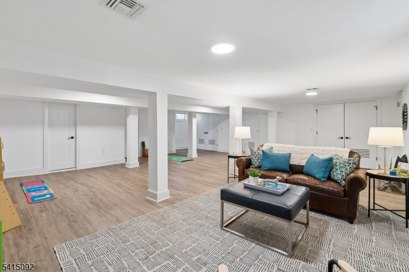 Incredible Maplewood dream home in a coveted location just steps from Village, trains and parks. Extensively renovated in 2024, this turn-key home offers nearly 4000 sq. ft. of living space across 4-levels with light-filled rooms arranged in a versatile, flowing floorplan. Enter into a dreamy, open-plan 1st floor which beautifully blends period details (beamed ceilings, wide moldings) with stunning modern finishes, including stylish lighting and wide-plank French oak flooring. The dream kitchen features high-end GE Cafe appliances, gas range with pot filler, quartz counters, tile backsplash, ceramic sink and full-height, soft-close cabinety. A breakfast bar with seating and serving bar with beverage fridge are nearby. Generous dining room and living room spaces, a sun-drenched family room, half bath and versatile sunroom overlooking the yard complete this level. Upstairs find bright bedrooms and 3 full baths, including the sophisticated primary with large walk-in closet and spacious bath with double vanity, soaking tub and glass-enclosed shower. The lower level is fully finished to offer leisure space, laundry room with sink and built-in cabinets and bonus full bath with shower and access to the garage. The fenced backyard features a composite deck overlooking a private, woodsy backyard. 2024 updates include a new roof and gutters, new thermal windows, new thermal side doors and custom built-in shelving. Smart home dimmers (1st flr), Nest thermostats and front door lock. GSMLS 4016684